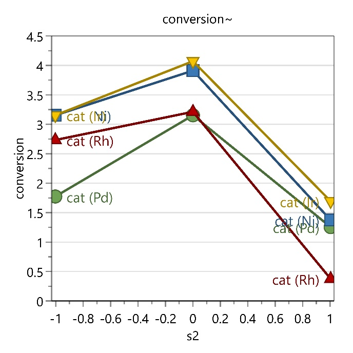 Both Rh and Pd catalysts achieved 100% conversion, with every ligand working in combination with Pd when toluene was the solvent. Analysis of the data showed that the ligands with Pd had no significance on conversion but the solvents played a big role, as seen by the interaction plots below, with less polar solvents achieving greater conversion.